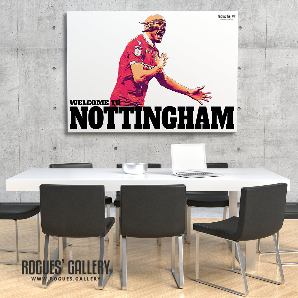 Iconic 'Welcome To Nottingham' design featuring Nottingham Forest centre half Yohan Benalouane celebrating scoring the vital early goal that defeated the Sheep on a memorable night at The City Ground.