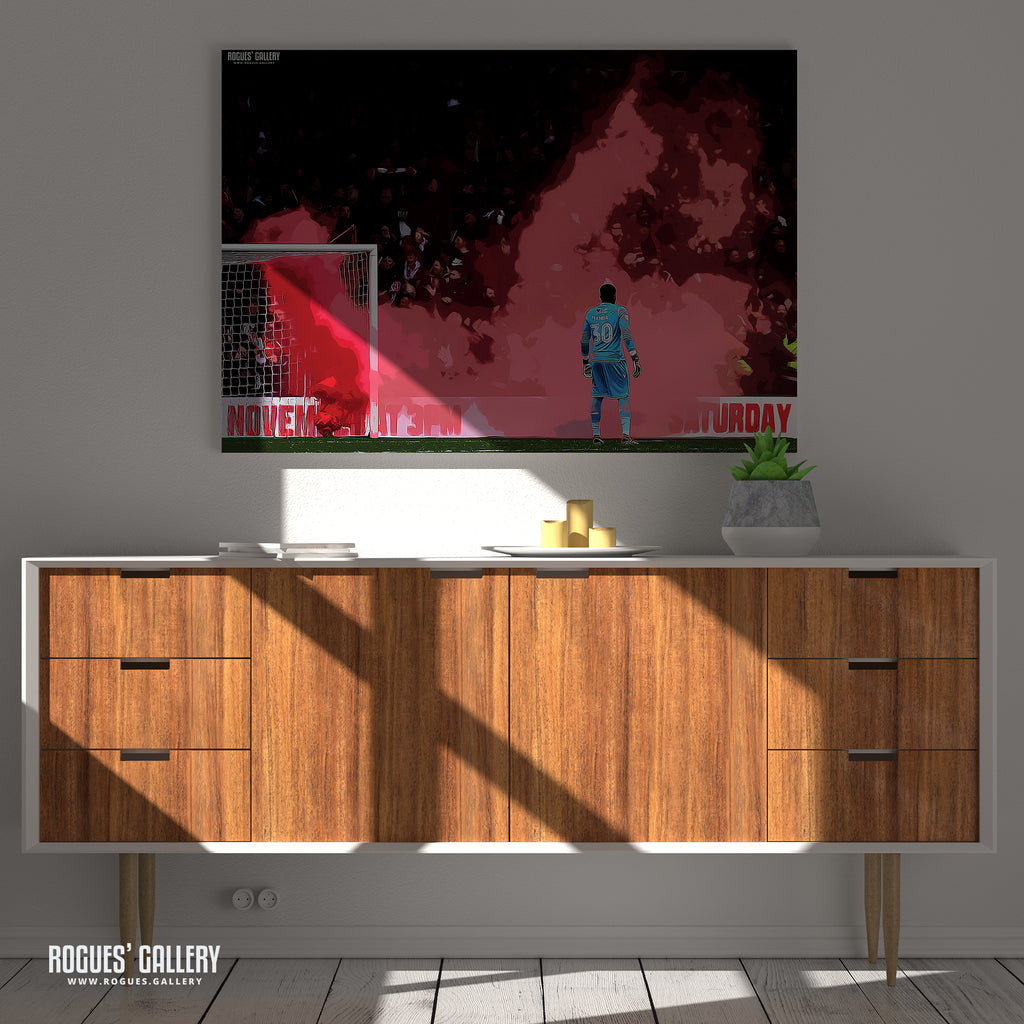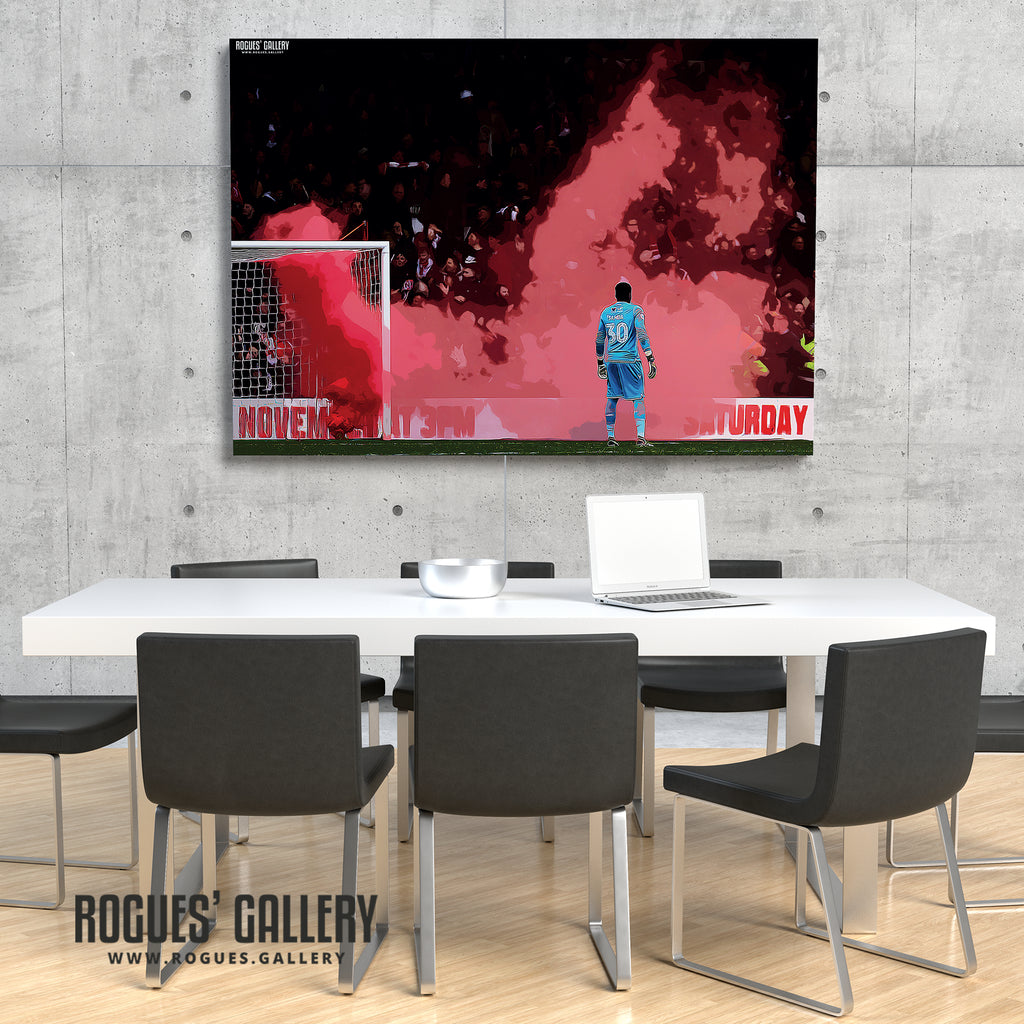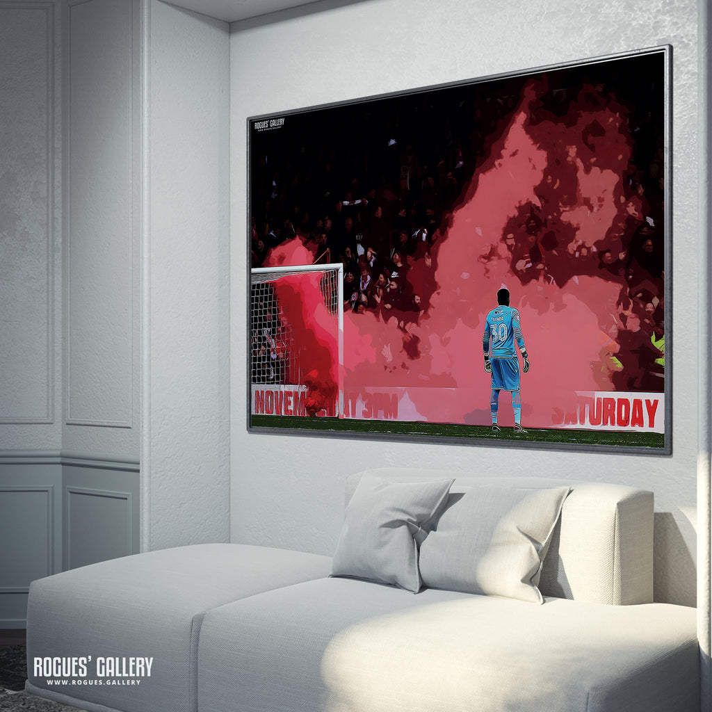 A3 art print of Brice Samba, the superb Forest 'keeper, dodging a flare at The City Ground.