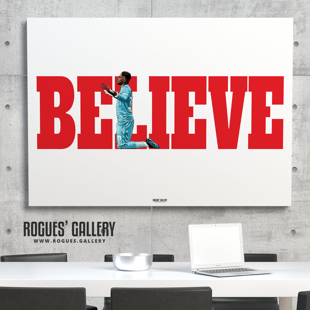 A portrait of Nottingham Forest's French goalkeeper Brice Samba saying his pre-match prayer available in two versions with 'Believe' or 'Have Faith' text. A3 has both printed, one on either side, bigger prints you need to select which option you want to order.