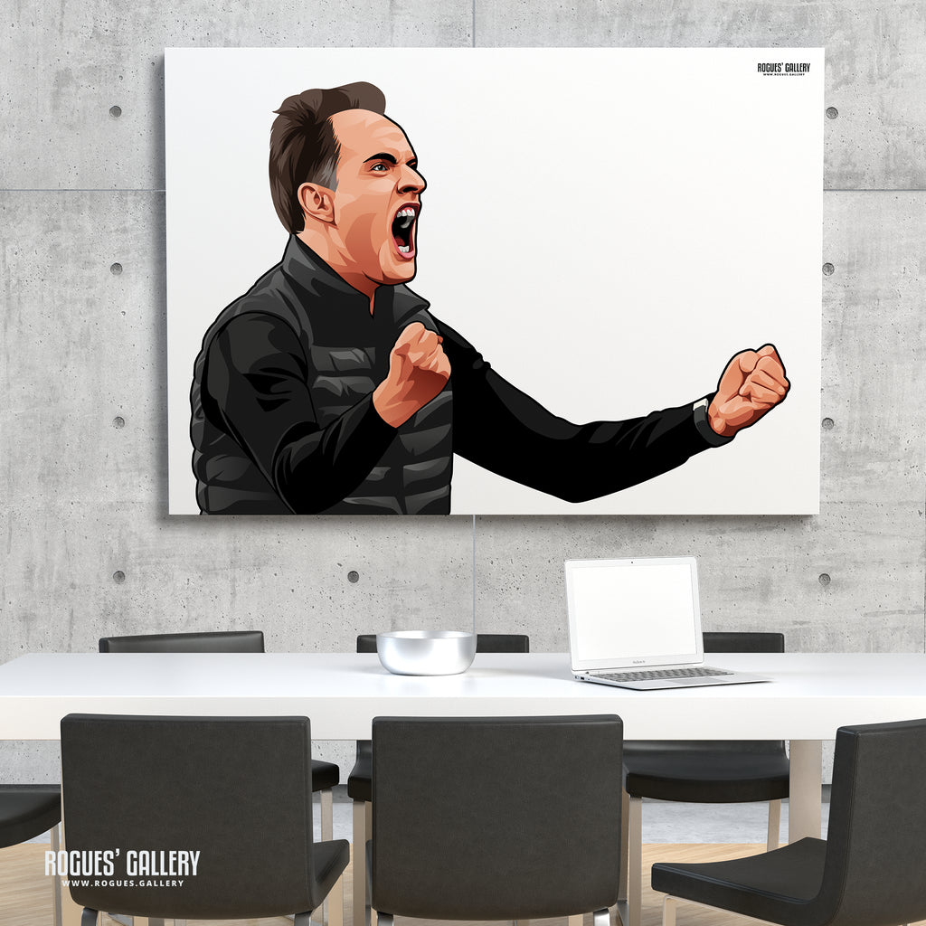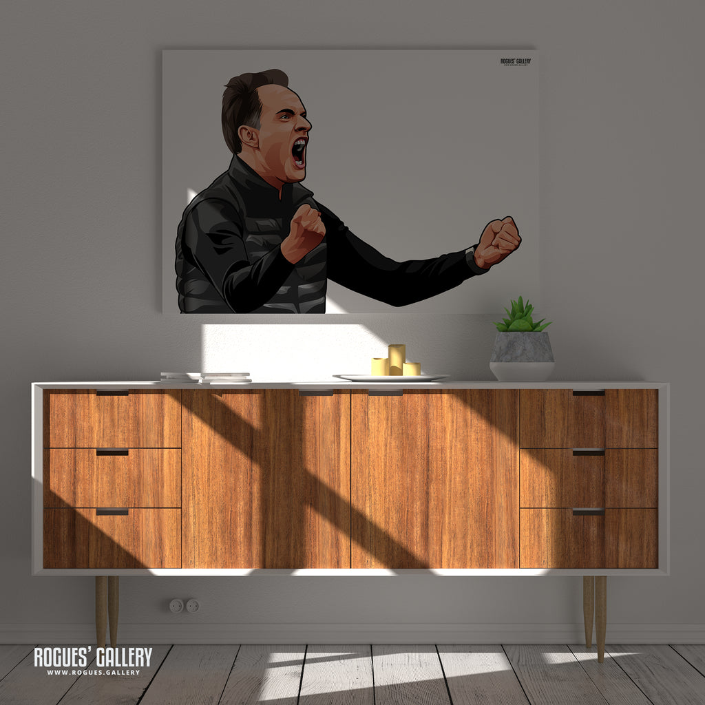 A portrait of Chelsea's instantly successful German coach Thomas Tuchel with his iconic celebration after claiming the 2021 European Champions League within months of taking over the reigns. Available in two designs with or without the iconic 'Welcome To Stamford Bridge' slogan.