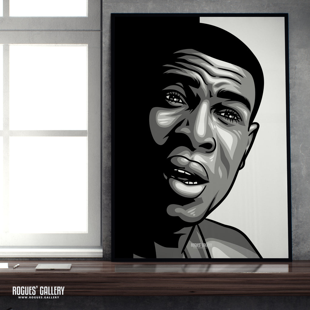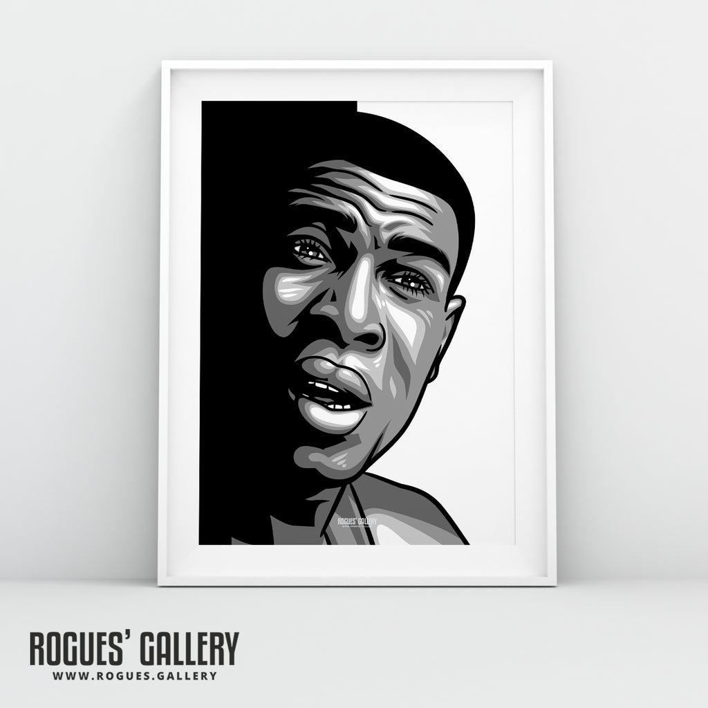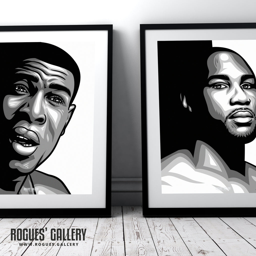 Superb quality black and white art print featuring a portrait of Frank Bruno the boxing legend, former multi Heavyweight World Champion and hugely popular former British boxer.
