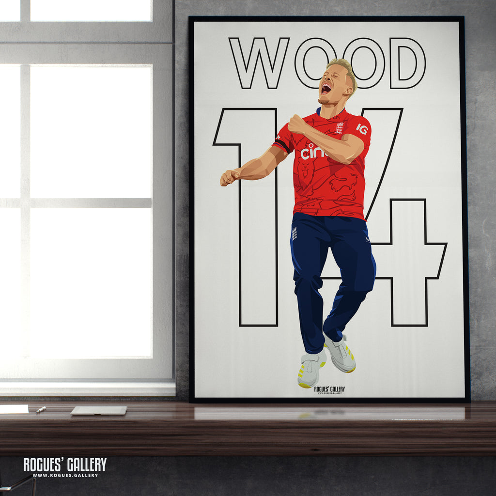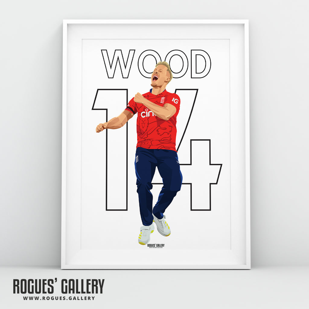 England's white ball bowler Luke Wood - available in two styles - celebrating taking a wicket for his country.