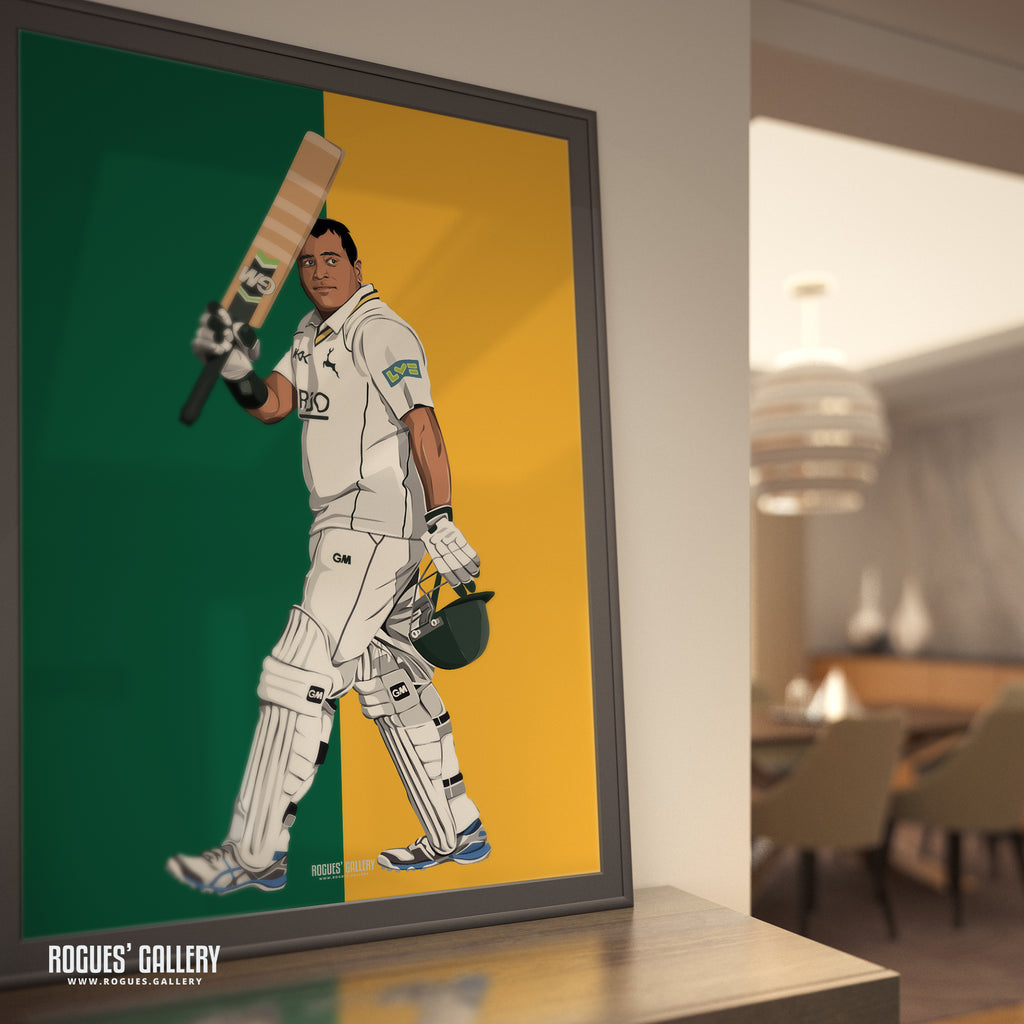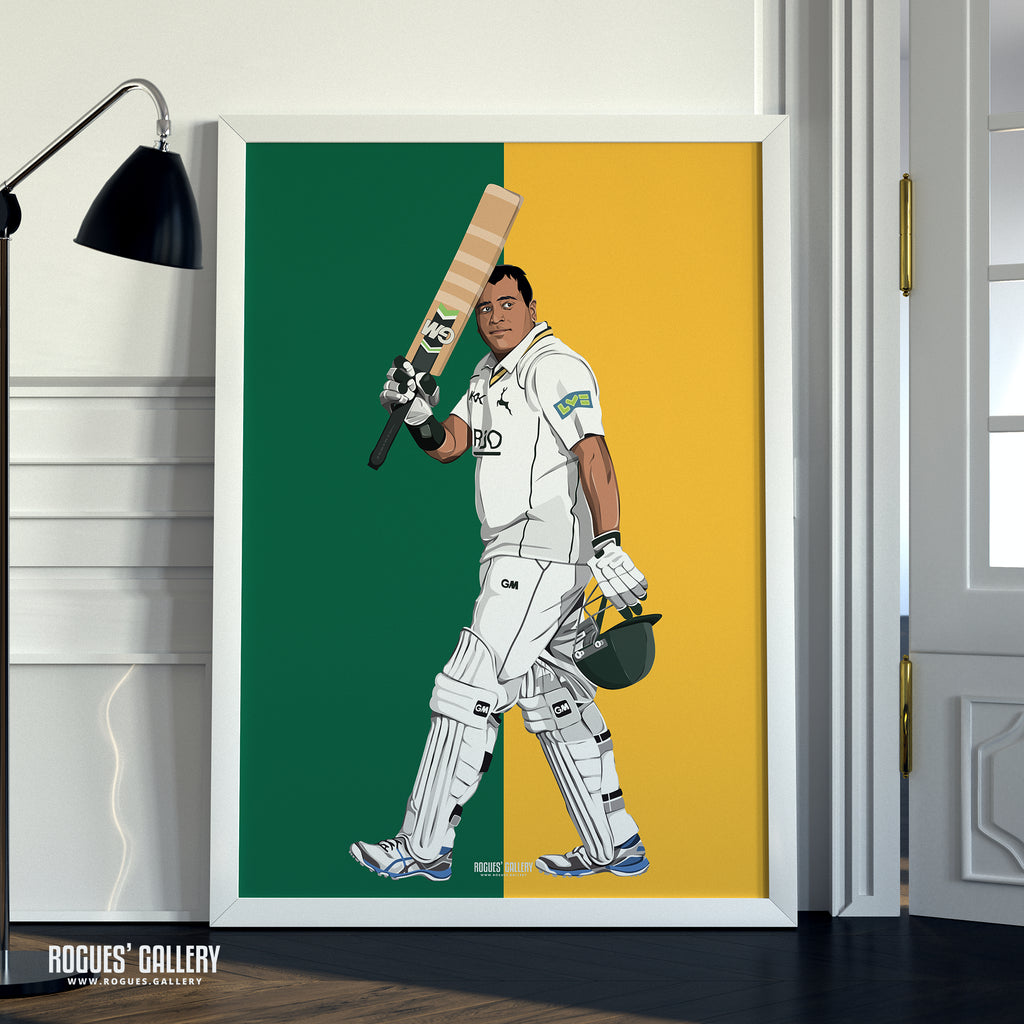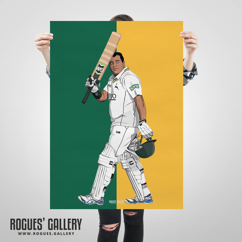 Superb quality A3 art print featuring former Notts' favourite all rounder, living legend and fan favourite Samit Patel. Released after he announced his departure from the club, ending an era, he will be missed. Three versions available plus a montage of him batting, bowling and lifting trophies.