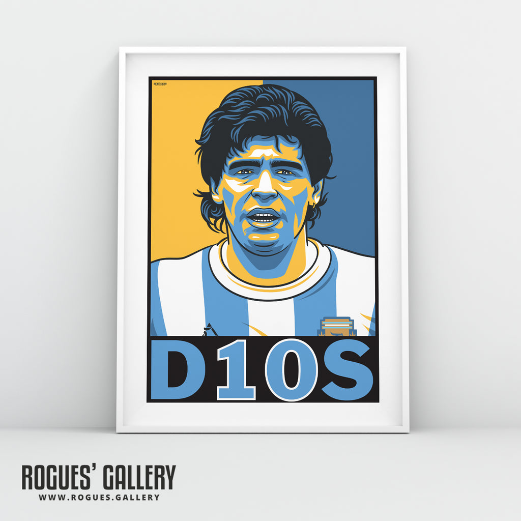 High quality A3 #GetBehindTheLads style print of the legendary Argentinian Number 10. The late, great Diego Maradona with his famous D10S or 'God' nickname.