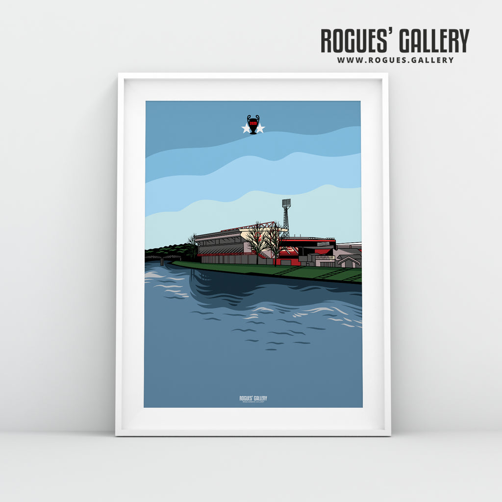 Superb quality print featuring The City Ground - the iconic image you see as you cross Trent Bridge and see it sitting so close to the river itself.