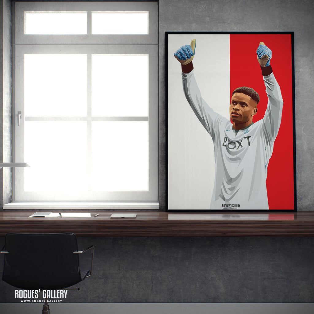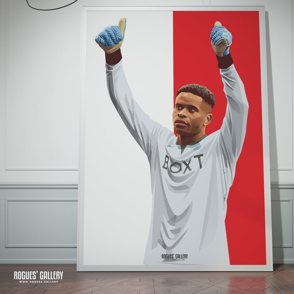 A new portrait of Nottingham Forest's popular French 'keeper Brice Samba. Saluting the fans at St. Andrews after a 3-0 win featuring a trademark wonder save with classic red and white colours behind him.