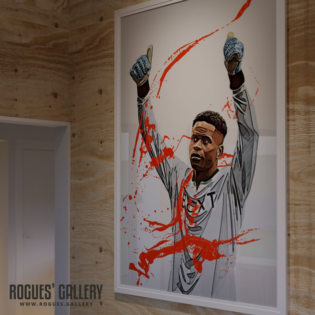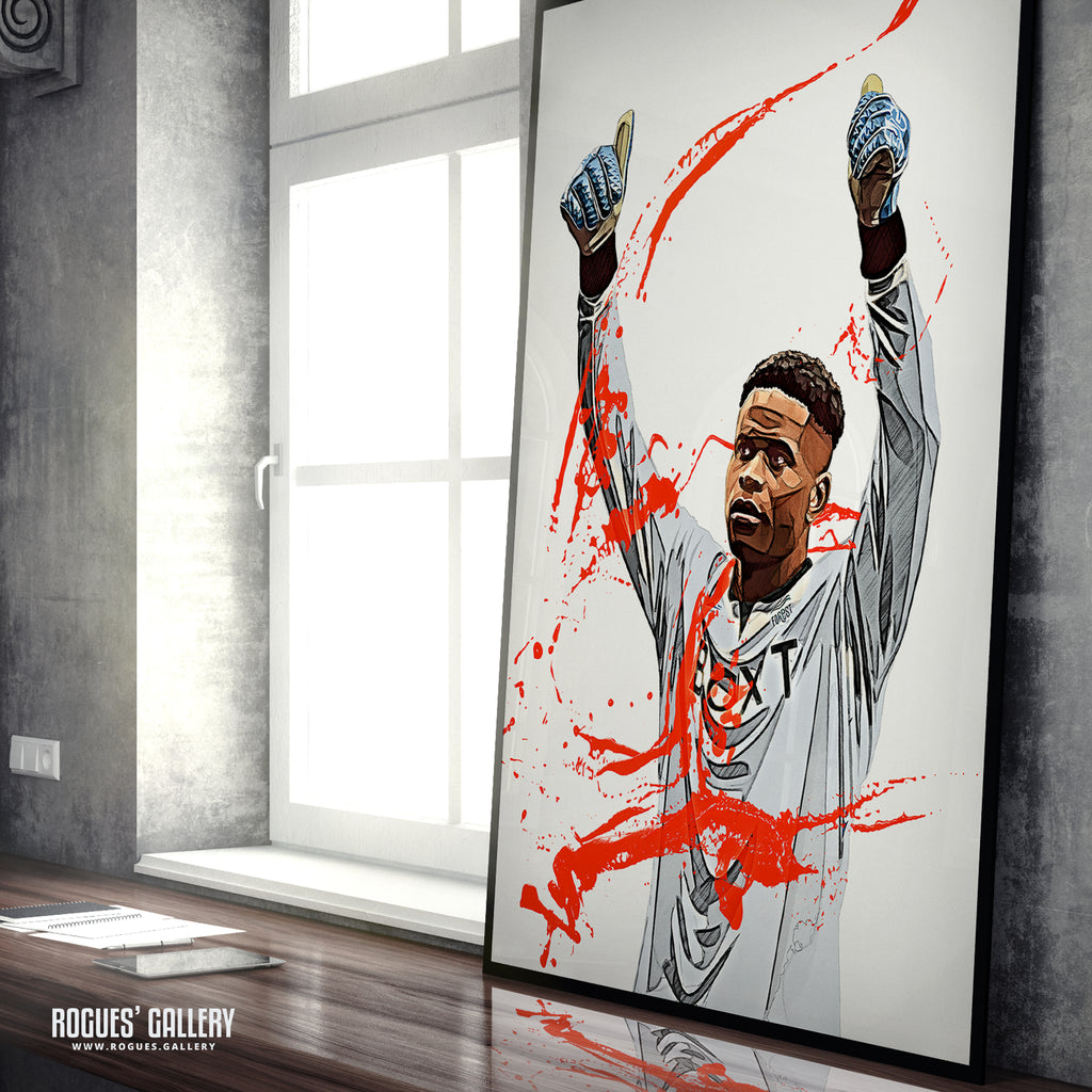 A new portrait of Nottingham Forest's popular French 'keeper Brice Samba. Saluting the fans at St. Andrews after a 3-0 win featuring a trademark wonder save.