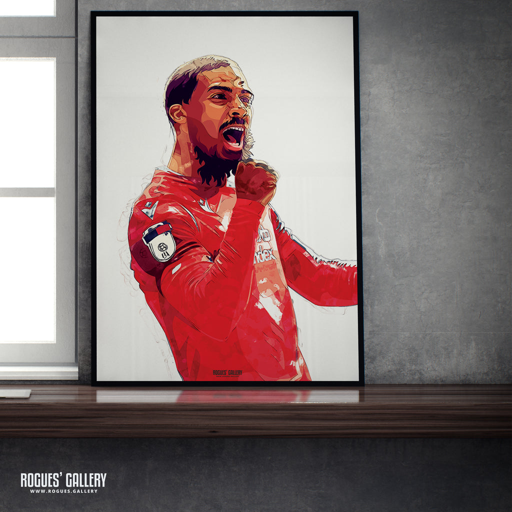 Iconic portrait of Nottingham Forest striker Lewis Grabban celebrating another goal at The City Ground.