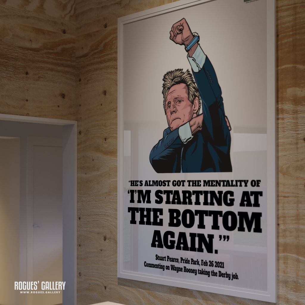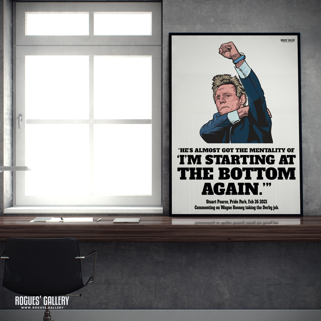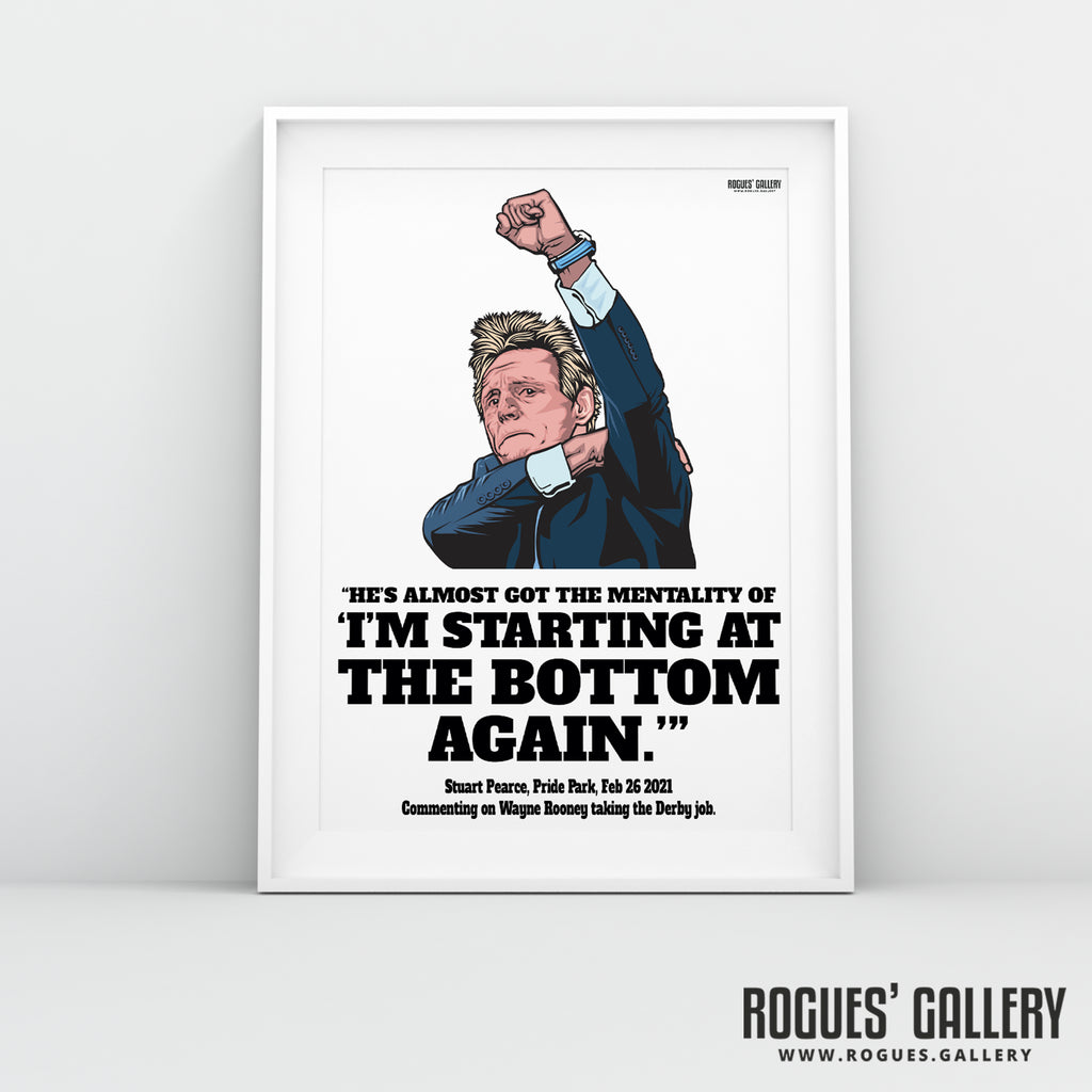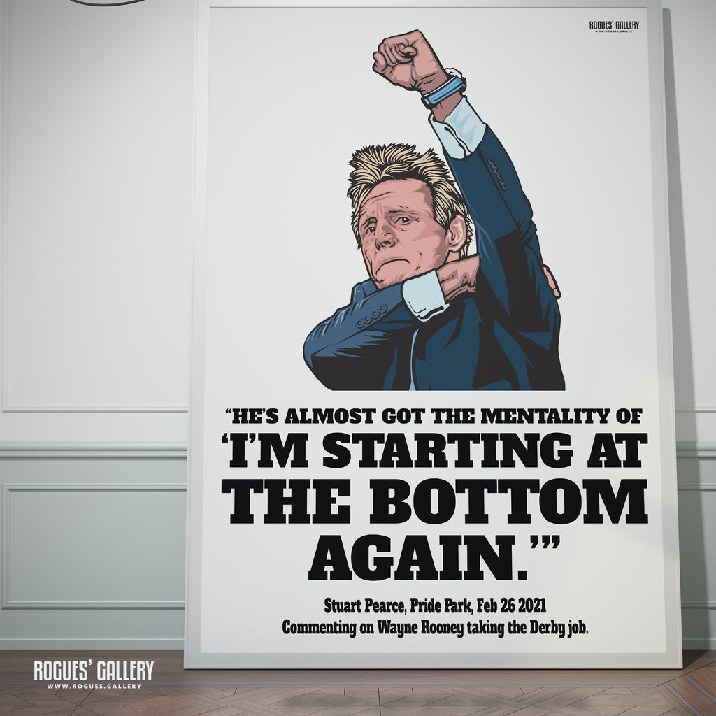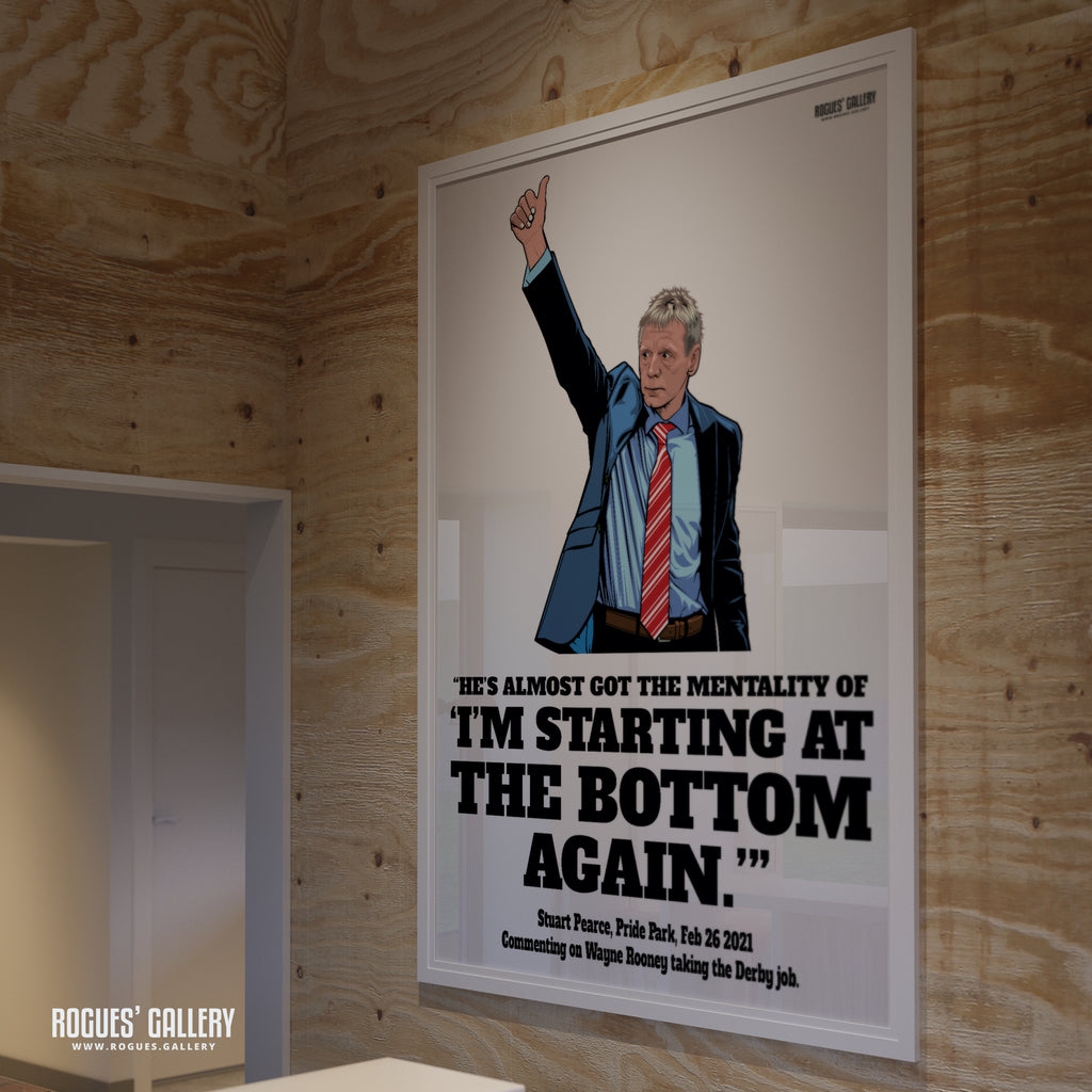 Portraits of Forest Stuart 'Psycho' Pearce with reference to his comment about Wayne Rooney's appointment commenting before the Derby fixture that he was 'starting at the bottom again.' Limited Edition of 250. Just 20 of A1, A2 and A0. Two versions available.