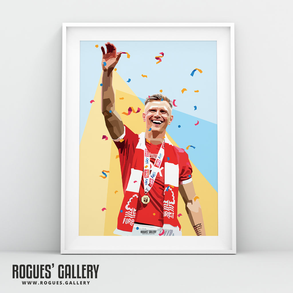 Few strikers have made such a positive impact as Sam Surridge has since joining Nottingham Forest. He hasn't had too long on the pitch but he's looked very sharp and already shown he has an eye for goal including his first senior hat trick. The cherry on the top though was helping Forest to a long awaited promotion. This design was created specifically for his birthday present which was his match shirt and medal along with this specially commissioned design.