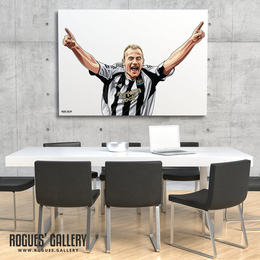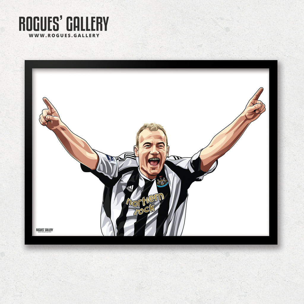 A portrait of Toon Legend Alan Shearer with his trademark goal salute - two versions available one with the iconic 'Welcome To St. James' Park' slogan and another with no text. The choice is yours!