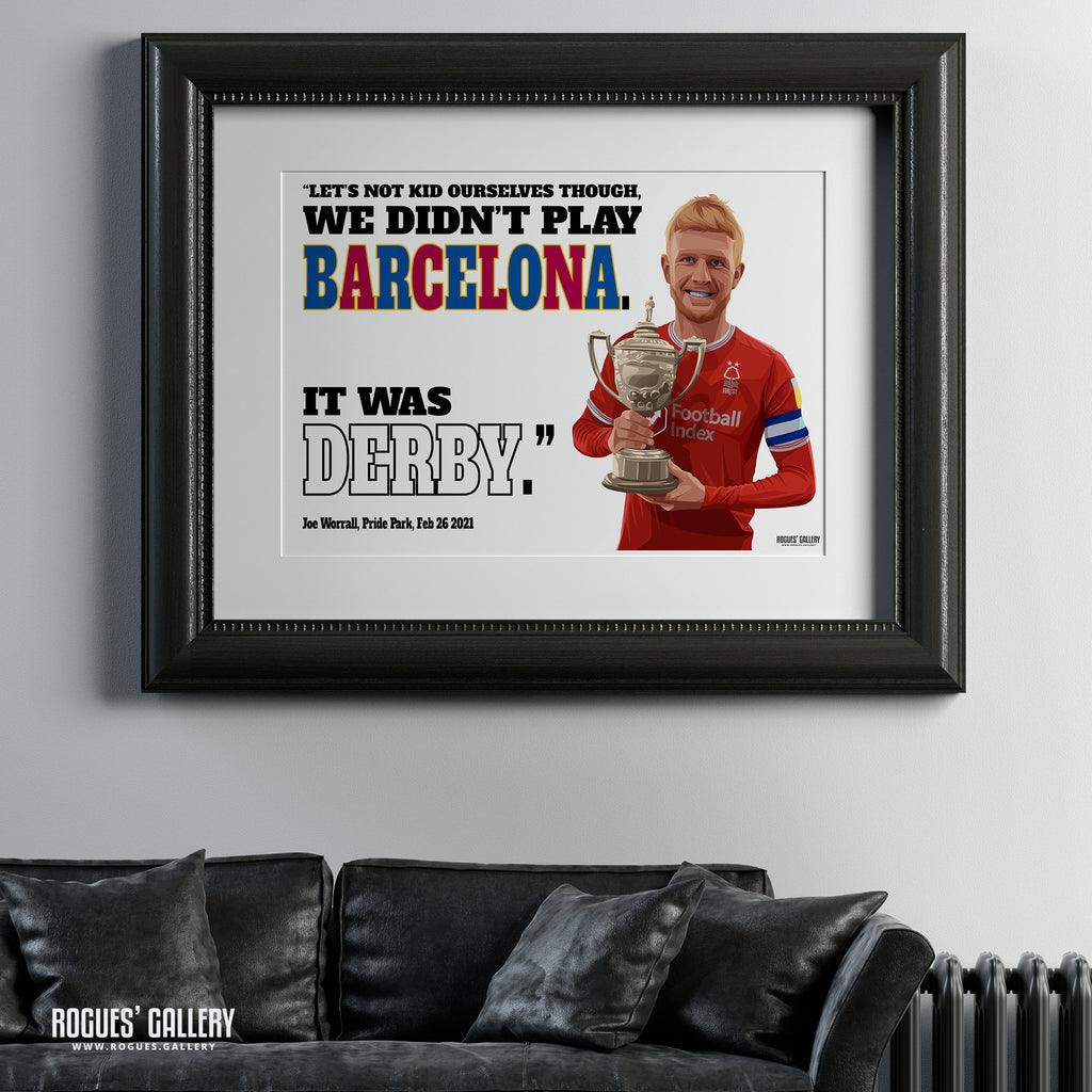 A portrait of Forest Joe Worrall holding The Brian Clough Trophy with iconic 'We didn't play Barcelona, It was Derby.' slogan. Ideal for framing.
