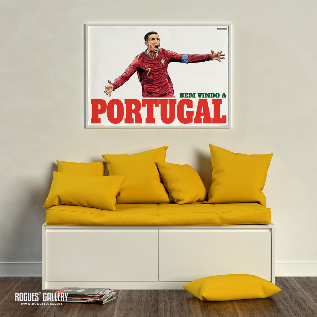 A portrait of Cristiano Ronaldo arguably the greatest footballer the World has ever seen in his International jersey with the iconic 'Bem Vindo a Portugal' slogan.