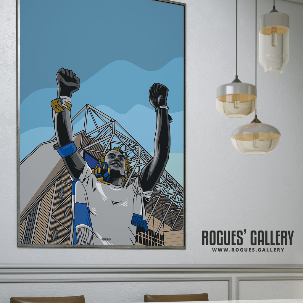 Superb quality print featuring Elland Road - the iconic statue of Billy Bremner adorned with scarves.