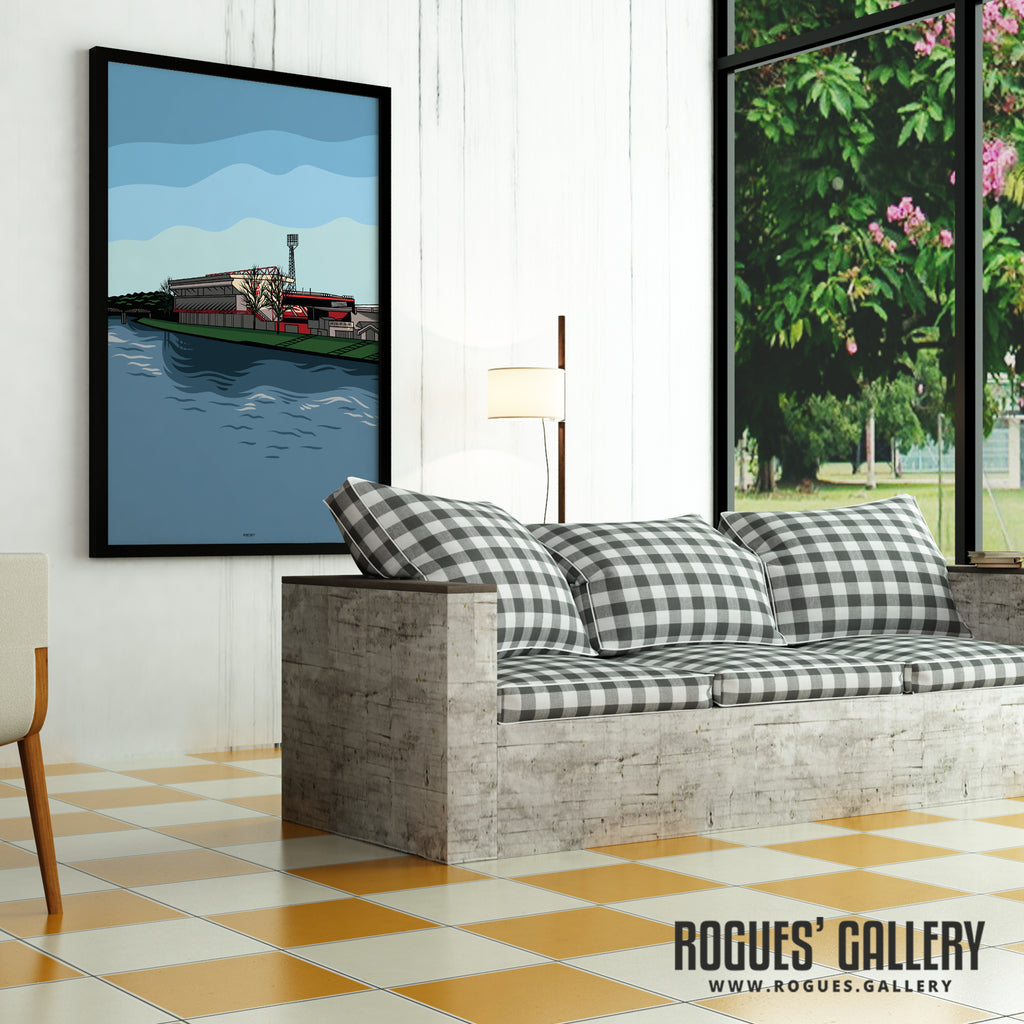 Superb quality print featuring The City Ground - the iconic image you see as you cross Trent Bridge and see it sitting so close to the river itself.