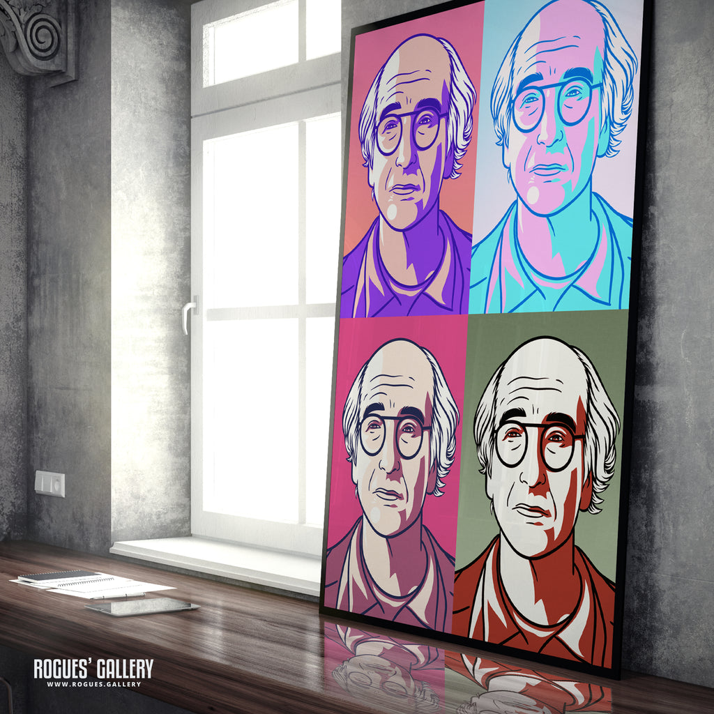 Modern Andy Warhol inspired pop art design featuring the famous stare from Larry David star of Curb Your Enthusiasm. This is the more muted coloured version, we also offer a brighter option available.