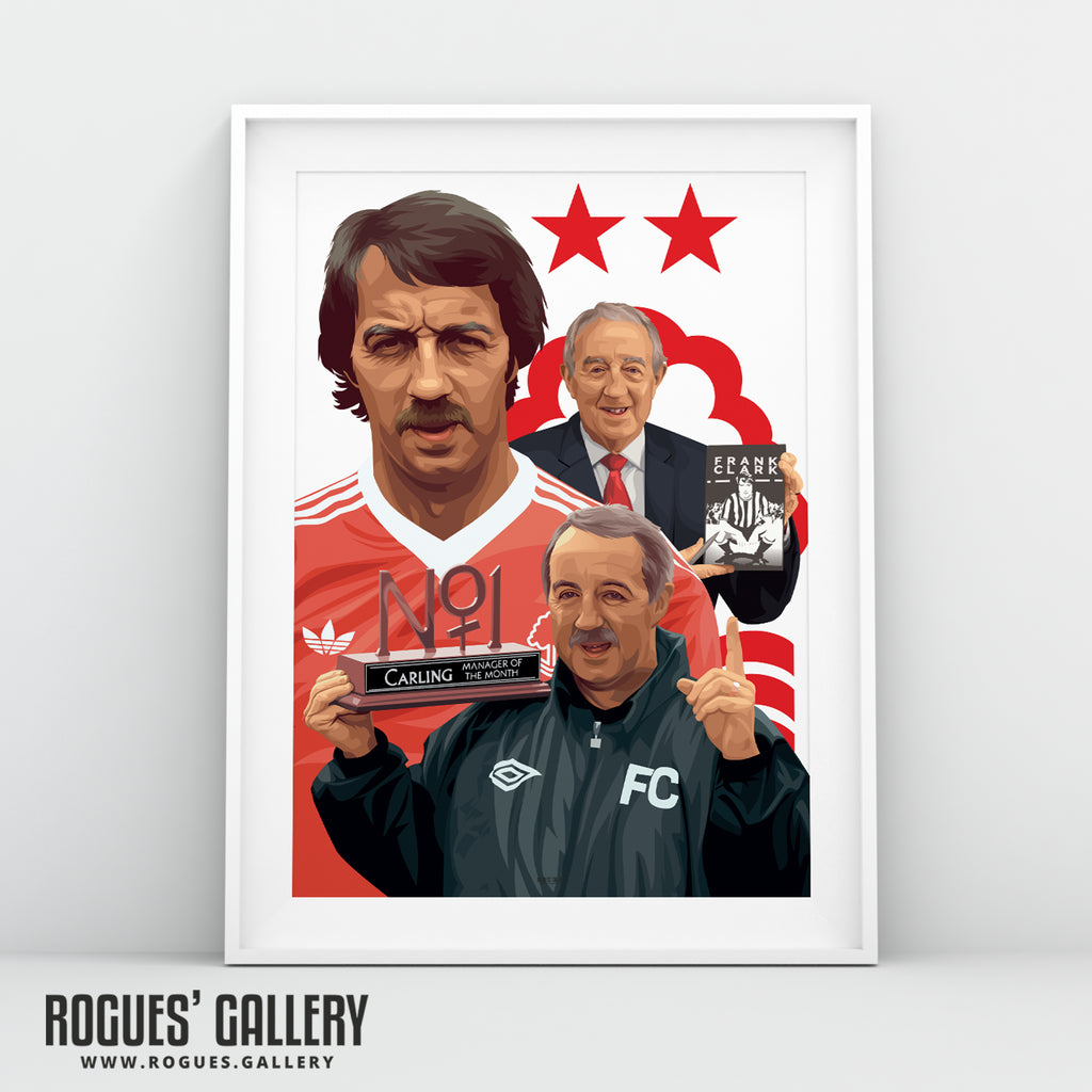 Superb quality prints featuring Forest legend Frank Clark in his three roles at Forest. From winning the European Cup on the pitch in 1979, to managing the team into the Premier League top 3 and into Europe - then into the Boardroom at The City Ground where he is still a regular visitor to this day.