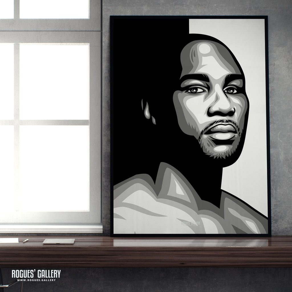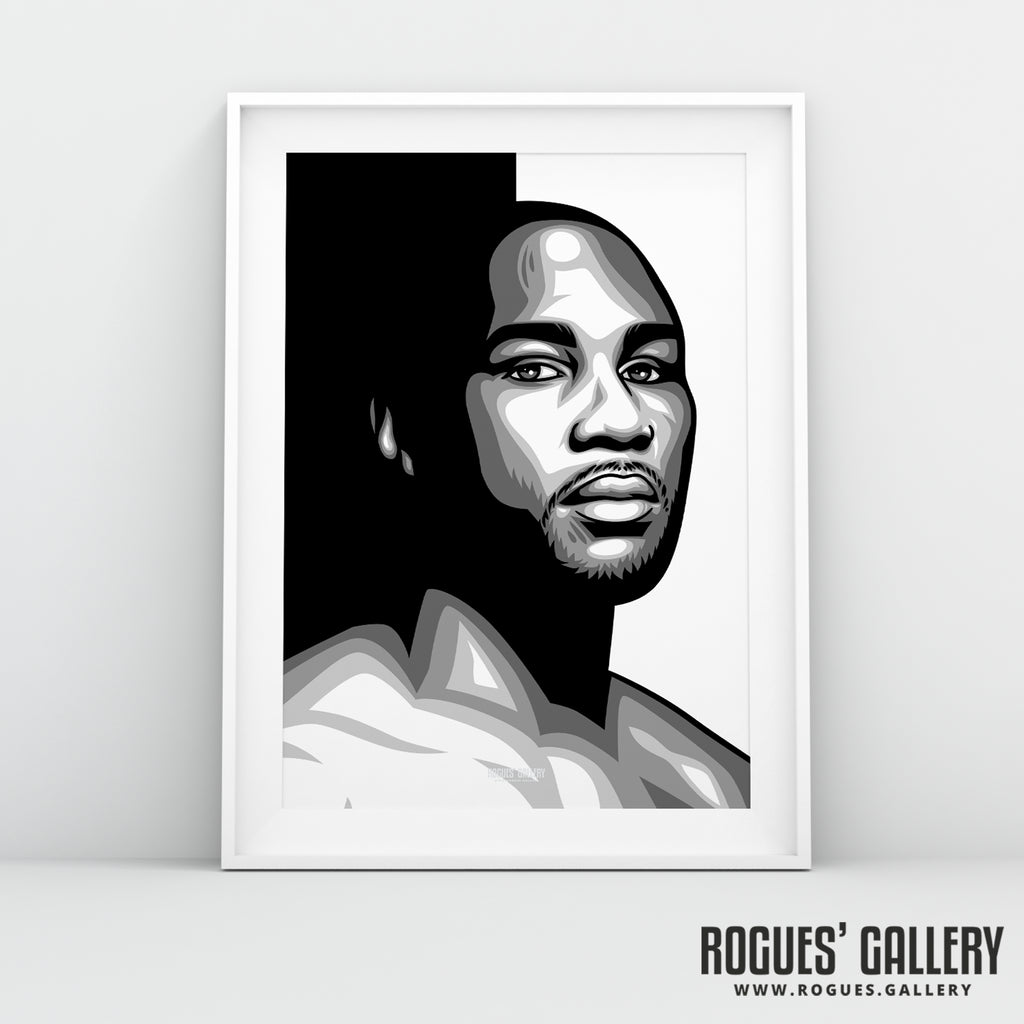 Superb quality black and white art print featuring a portrait of Lennox Lewis the boxing legend, former multi Heavyweight World Champion and widely considered the one of the greatest boxers ever born.
