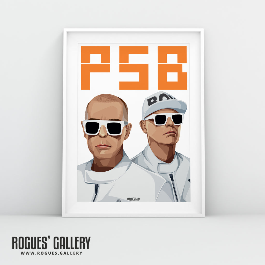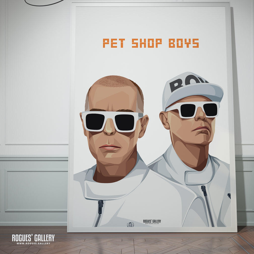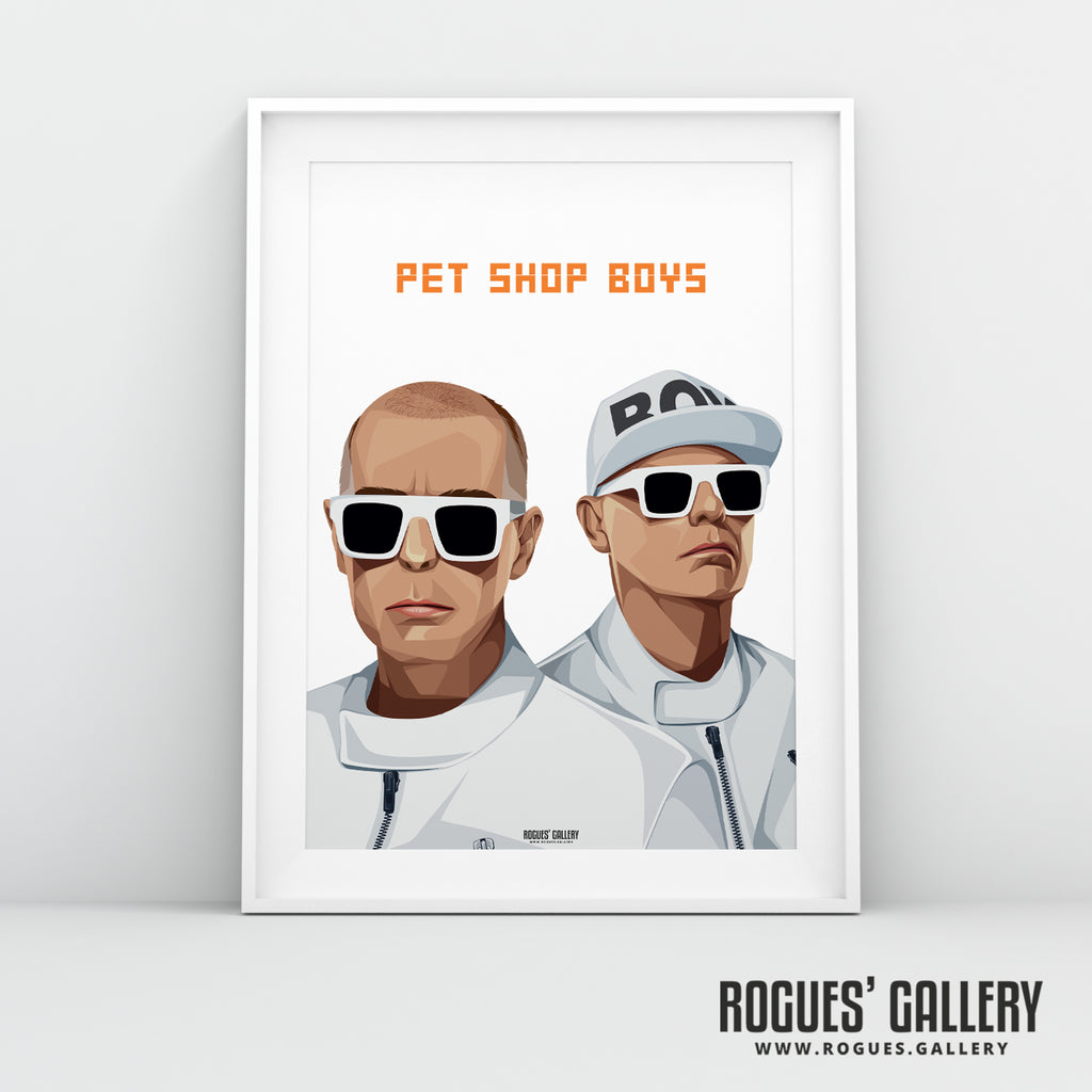 Icon design featuring Neil Tennant and Chris Lowe also known as the Pet Shop Boys wearing the sunglasses they are famous for. Ideal for framing or autographing. Two versions available featuring different text.