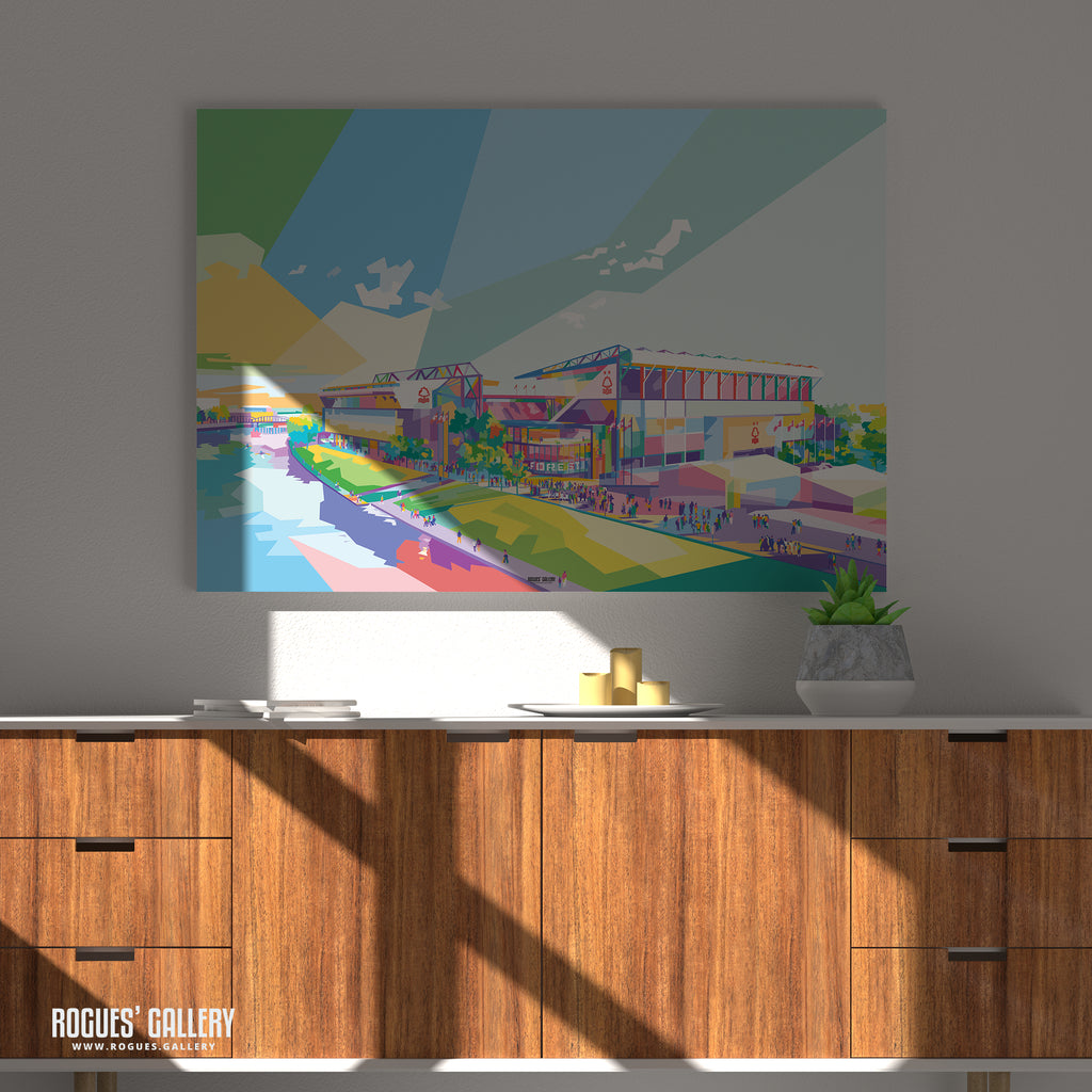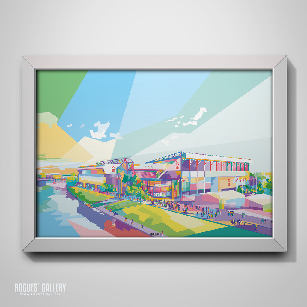 A modern take on an iconic view of The City Ground after completion of the proposed development of the ground scheduled for 2021 or thereafter with bright, modern art.