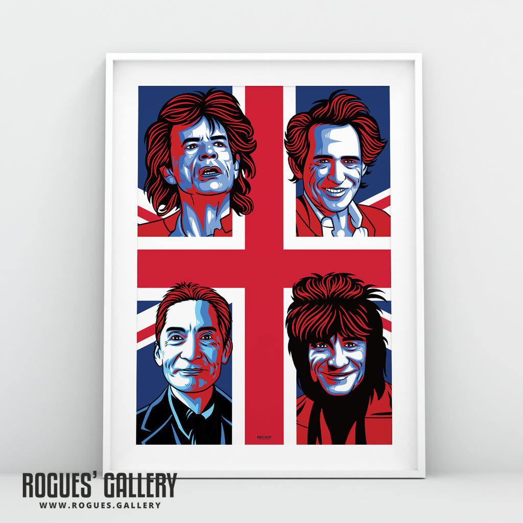 One of the most iconic bands in the history of rock - The Rolling Stones! Worthy subjects for our design featuring the Union Flag along with all for of the band. Check out out range of bold new designs available in a range of sizes ideal for any home. Ideal for framing.