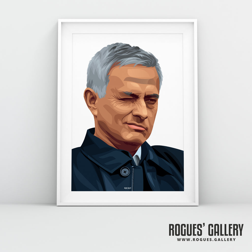 An iconic portrait of Spurs Boss Jose Mourinho doing his famous wink.